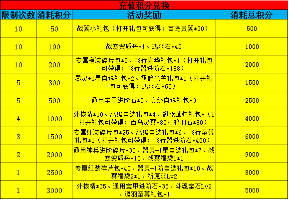 活动说明:以上活动奖励,玩家每次兑换扣除相对应积分点,积分点或者兑换次数使用完,将不可兑换该档次奖励,