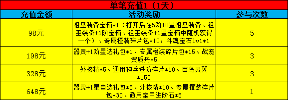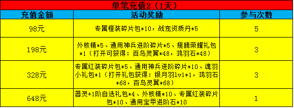 活动内容:单笔充值对应额度即可领取丰富奖励,每个档次限量抢购!